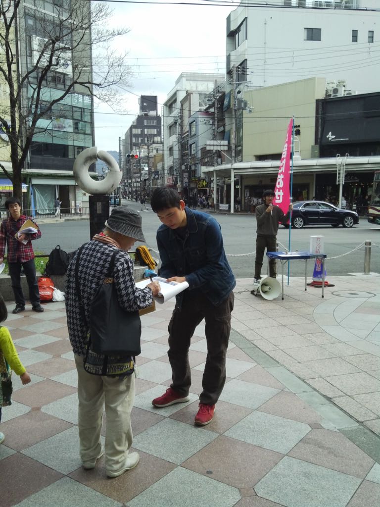 街頭に出て驚くのは、多くの人が弾圧を知っていることです。ビラを受け取り、「京大反戦ストライキ」という文字を見ただけで「弾圧許せない」と積極的に署名をかいてくれました。弾圧への怒りは京都の地でも怒りの炎となって燃え上がっています。