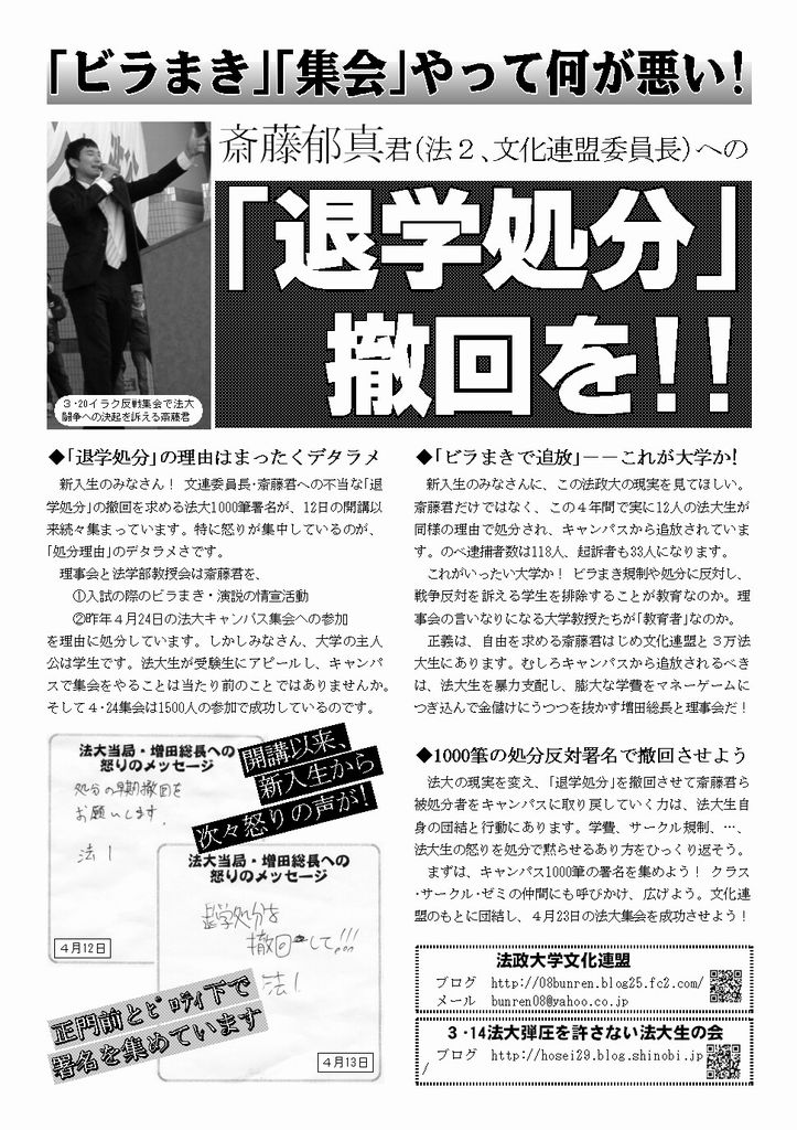 新入生のみなさん! 文連委員長・斎藤君への不当な「退学処分」の撤回を求める法大1000筆署名が、12日の開講以来続々集まっています。特に怒りが集中しているのが、「処分理由」のデタラメさです。