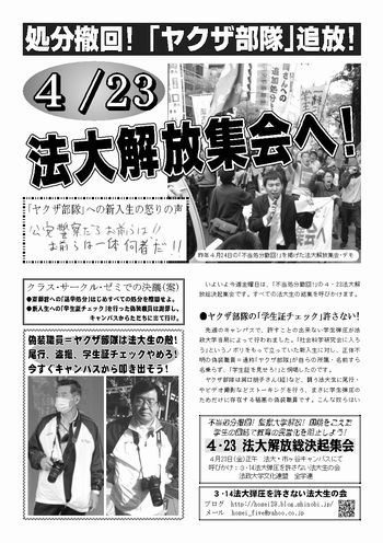 そのために、斎藤君をはじめすべての処分を撤回させ、法大生の敵=ヤクザ部隊を叩き出そう! 特に新入生のみなさん、23日はキャンパス集会から一緒にデモをやろう!