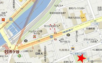 東郷公園は、市ヶ谷駅から徒歩15分の場所です。地図で★印の場所です。