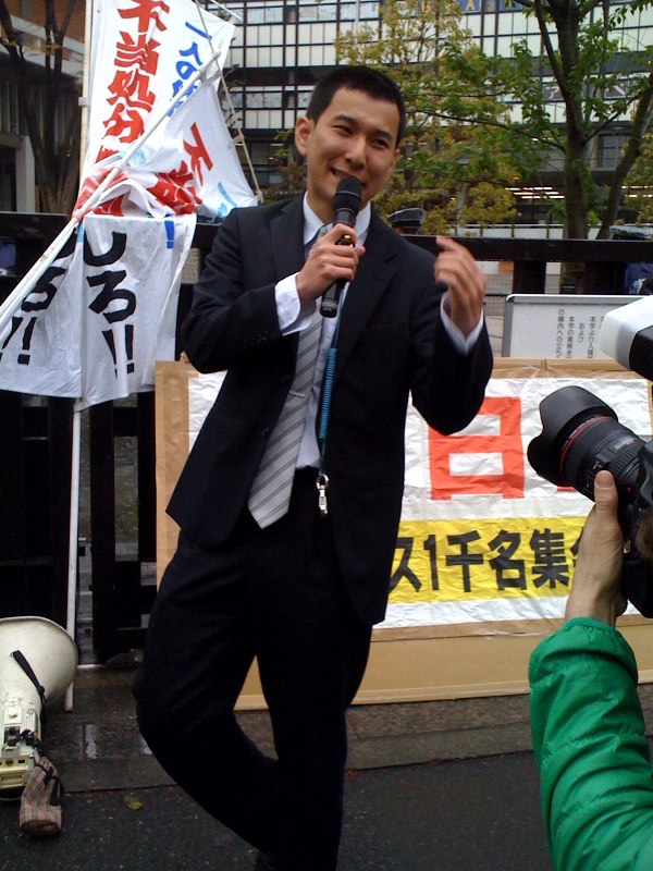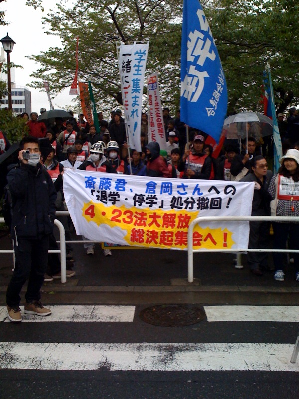 始まりました!! まず文化連盟委員長・齋藤君よりアピール!! 「キャンパス中央封鎖を徹底弾劾し、自らにかけられた退学処分を粉砕しよう!」とアピール!!