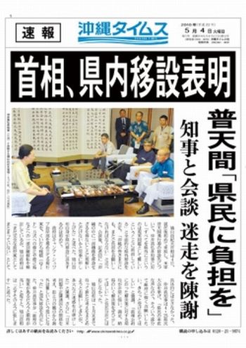 今日、5月4日、鳩山首相が沖縄入りし、辺野古への基地建設を正式発表した! ナンセンス!