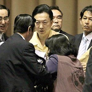 宜野湾市での「対話集会」後、怒りの声をあげた市民に詰め寄られる鳩山首相(5月4日)