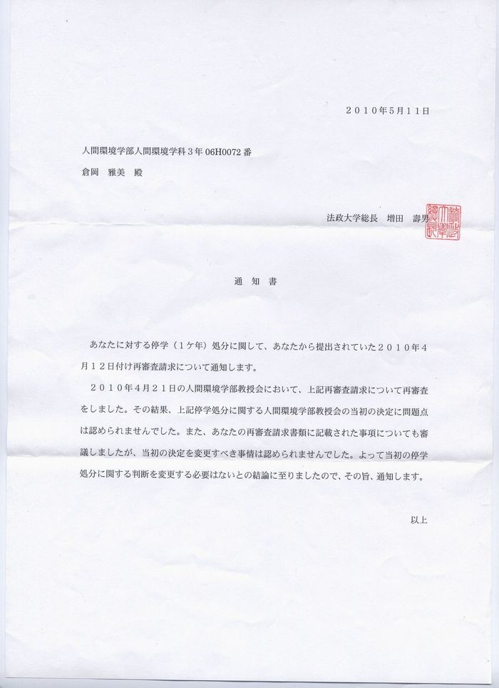 人間環境学部教授会は倉岡さんへの不当な「停学一年」処分を撤回しろ!