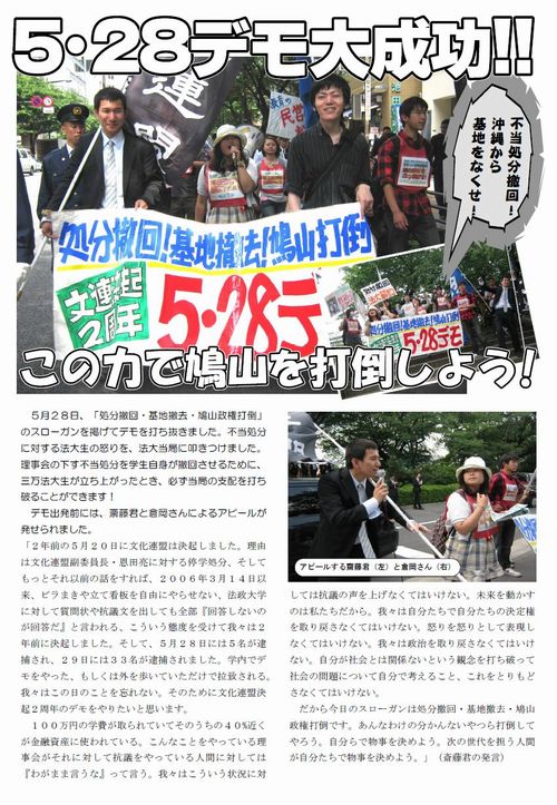 5月28日、「処分撤回・基地撤去・鳩山政権打倒」のスローガンを掲げてデモを打ち抜きました。