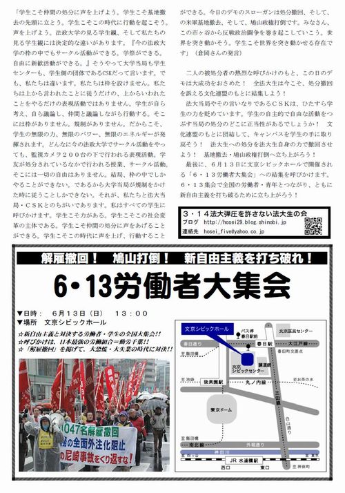 文化連盟のもとに団結して、キャンパスを学生の手に取り戻そう! 法大生への処分を法大生自身の力で撤回させよう! 基地撤去・鳩山政権打倒へ立ち上がろう!