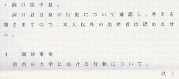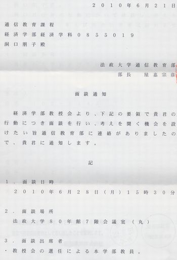 呼び出しの日時は、6月28日(月)15時30分だ! 面談事項として「貴君の大学における行動について」と書かれてある。「大学における行動」とは一体何なんだ! キャンパスで、仲間の処分撤回を訴え、学祭規制反対を言うことが、処分の理由なのか! 絶対に処分を阻止するぞ! 学祭説明会(本日22日、18時30分@511教室)に集まろう! 洞口さんと団結しよう!