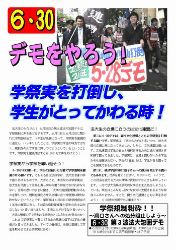 法大生のみなさん! 6月30日の第3波法大包囲デモは、学祭規制に声をあげるデモです。6月11日と6月22日に開かれた学祭説明会で、1年生が先頭に立って、学祭実を徹底的に追及し、ハッキリしたことは、学祭実は学生の味方ではなく、規制をのんで学生に押しつけようとしているということです。学祭実を徹底弾劾する6・30デモで声をあげよう!
