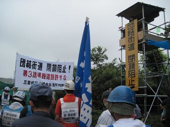 現闘本部から団結街道上の北側も封鎖。バリケードがつくられている