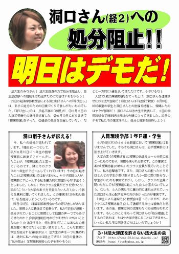 学生注目!! 法大生のみなさん! 経済学部の洞口朋子さんに教授会より呼び出しがありました! 「洞口って何? それおいしい?」という人もいるかもしれません。いつも大学に反対するビラをまいている女性といったら分かるでしょうか?