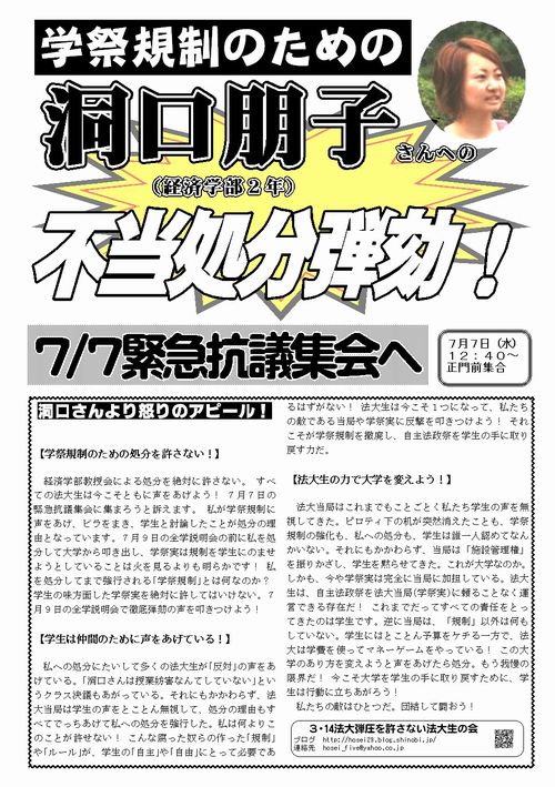 しかしながら今回洞口さんが徹底査問されている罪状は「ビラまき 」です。彼女は2種類のビラをまいたことで法政大学の学籍を剥奪されようとしています。1つは今年の2月5日朝、新入生を対象に1時間弱配布したビラ。もう1つは先月6月10日1限前、担当教授ならびに当該クラスの許可を受けて某クラスで10分弱配布したビラ。私たちはビラをまいただけでの停学・退学など「やりすぎ」以外の何者でもなく到底フェアではない、と考えます。