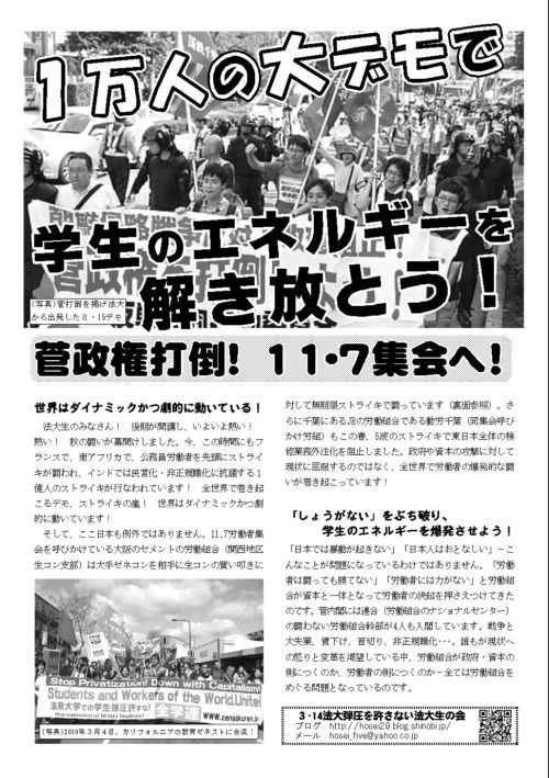 後期が開講し、いよいよ熱い! 熱い! 秋の闘いが幕開けしました。今、この時間にもフランスで、南アフリカで、公務員労働者を先頭にストライキが闘われ、インドでは民営化・非正規職化に抗議する1億人のストライキが行なわれています! 全世界で巻き起こるデモ、ストライキの嵐! 世界はダイナミックかつ劇的に動いています!