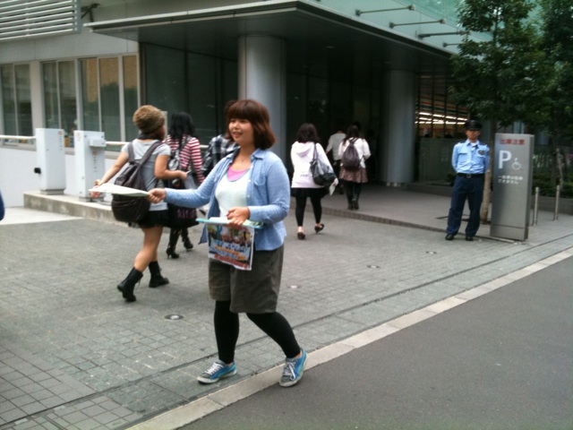 倉岡さんがビラをまく後ろで背面監視をするガードマン・富山。
