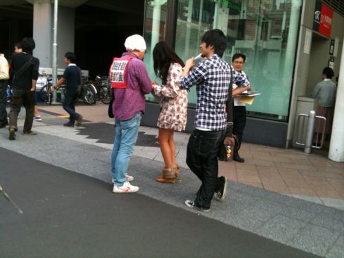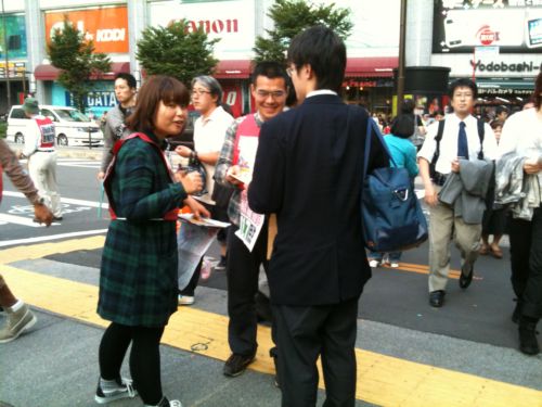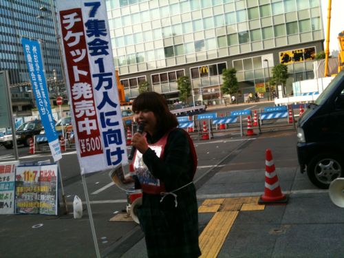 そして我らが全学連副委員長、文化連盟でもある倉岡雅美さんも駆けつけてマイクを握り、秋葉原駅前を通行中の労働者・学生に訴えまくりました!!