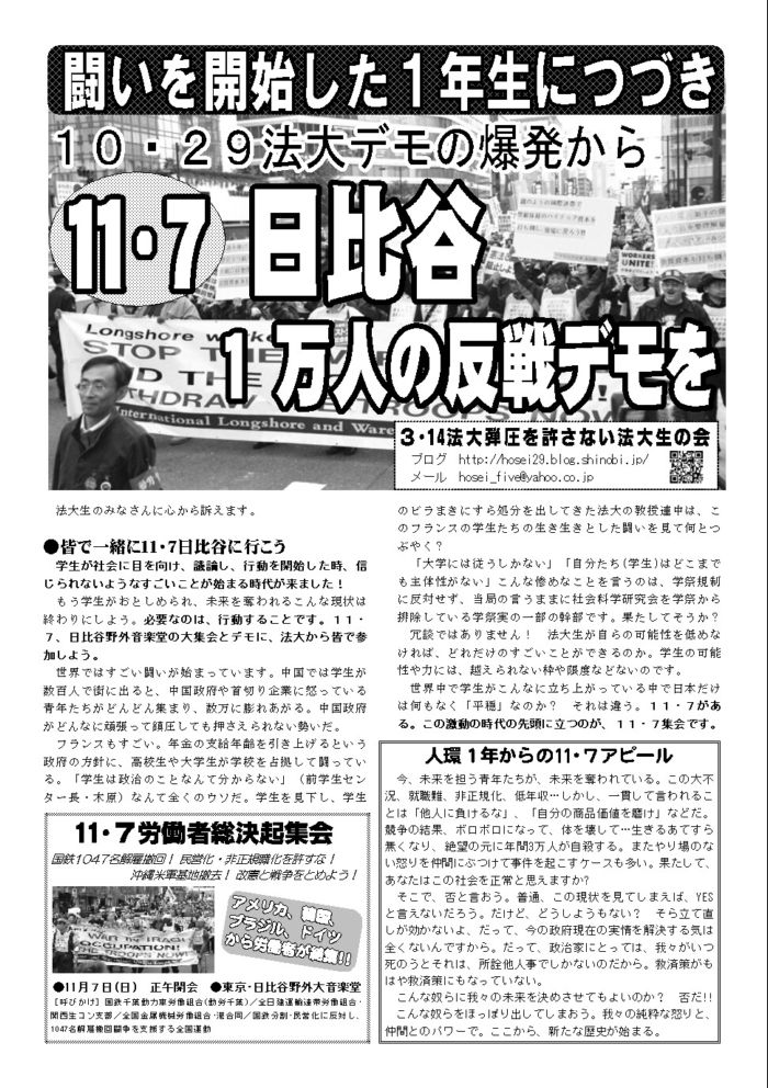 最後に、法大生こそ反戦闘争の主人公として11・7に行こう。