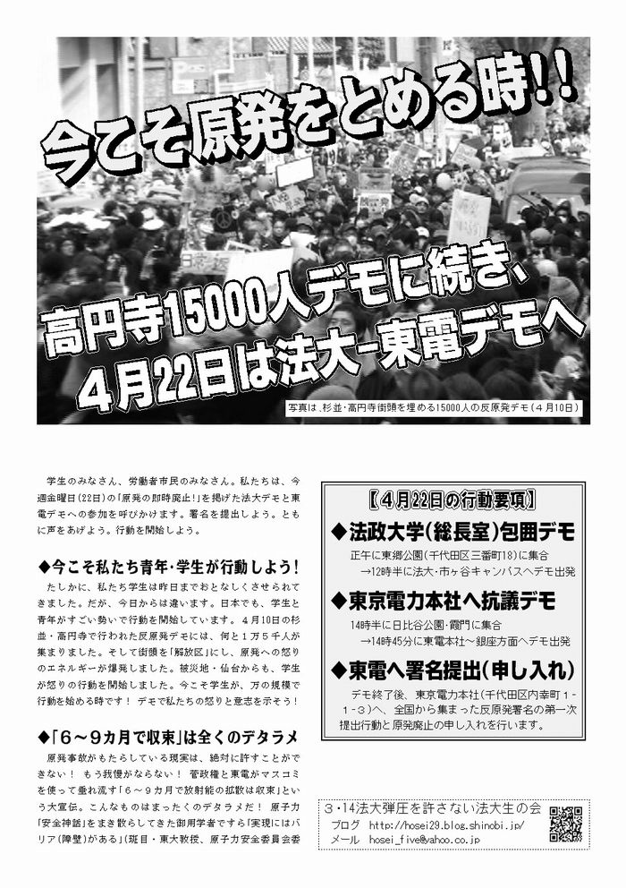 学生は、こんなあり方に絶対反対です。法大から行動に立ち上がろう! 学生が団結して行動すれば、どれほどの力があるか。高円寺の反原発デモの1万5千人のほとんどが若者、学生です。この力があれば「大学の決定だ」と学生の意志を押しつぶして処分し、サークルの新歓すら破壊してきた法大当局の支配など一瞬にして吹き飛ばせる! エジプトでは青年・学生が行動に立ち上がり、この社会を変え革命はできると示しました。エジプトのように社会を変えよう! すべての学生は、22日の法大・東電デモに仲間を誘って総決起しよう! 署名を東電に叩きつけます。反原発署名を全力で集めて、デモに持ってきてください!!