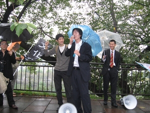 「13日法学部の教授会では斉藤君の処分攻撃を阻止したぞ!」仲間たちは雨天の中を突く勢いでキャンパス集会を貫徹!
