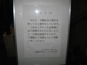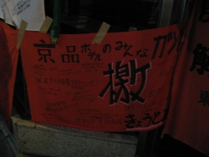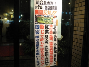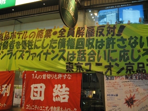 東京・品川駅前にある「京品ホテル」は、組合に対して、リーマン破綻にからんだ経営不振を理由に10月20日付けで130名全員解雇・廃業を通告してきた。これに対し、組合はホテルの存続と解雇撤回を要求して自主管理、生産管理闘争をたたかっている。急きょ、品川まで行ってきた!