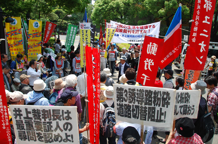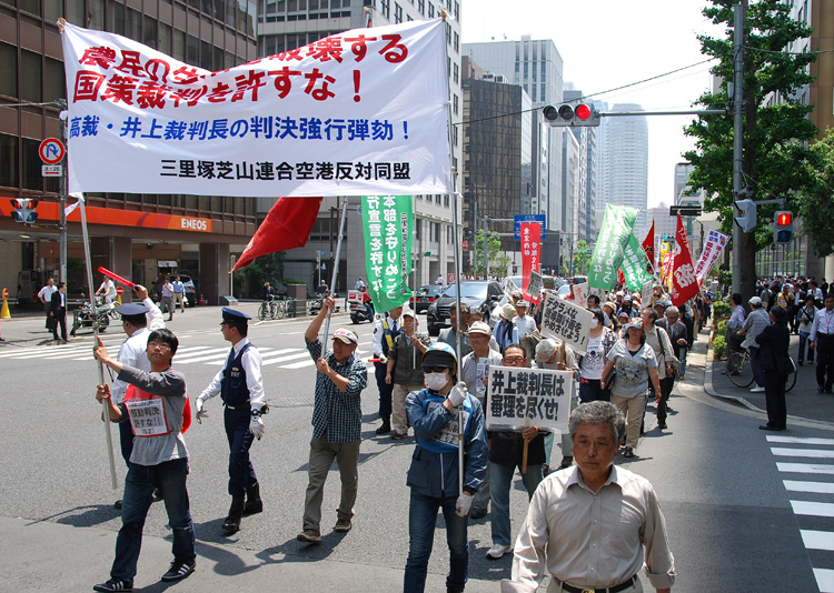 法廷に現われた井上裁判長は冒頭、「忌避の申し立ては裁判を意図的に遅延させる目的であり、却下する」と言い放った。傍聴席からは怒号が飛ぶ。しかし、井上は間髪いれずに、「控訴を棄却する。仮執行処分を付する。裁判費用は全額被告が負担する」と言い捨てて法廷から逃げ去った。その間わずか1分、あっという間だ。「ふざけるな!」「こんなものは裁判じゃない!」反対同盟と支援の仲間はこのふざけきった判決に対して徹底弾劾をたたきつけた。