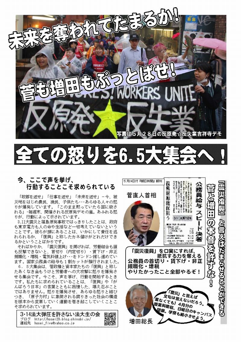 6.5大集会は、菅政権と資本家たちの「復興」と称したあくなき金もうけと労働者への大攻撃に怒りを爆発させる集会です。今こそ、声を挙げ、行動を開始するときです。私たちに求められていることは、「復興」や「がんばろう日本」の言葉とともに我慢した、堪え忍ぶことではありません。怒りを爆発させ、あらゆる怒りと結びつき、「原子力村」に象徴される腐りきった社会の構造を根本から変革していく運動を巻き起こしていくことこそ求められています。