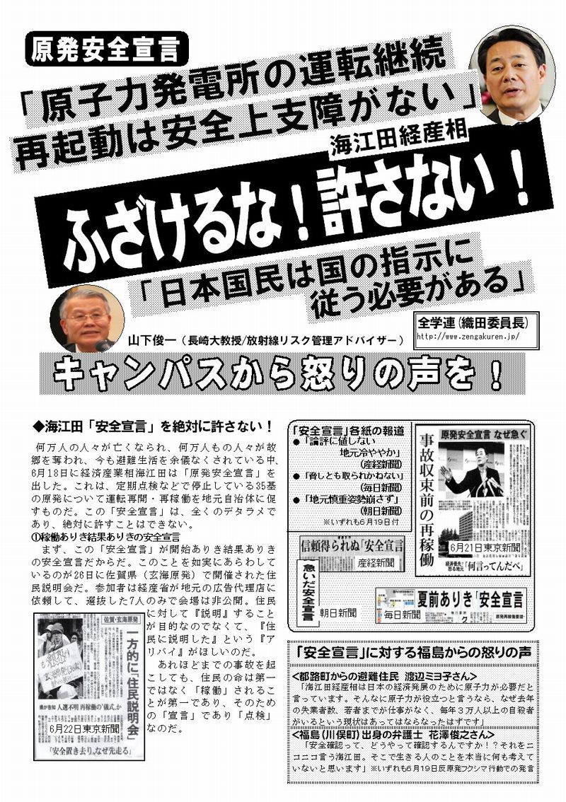 何万人の人々が亡くなられ、何万人もの人々が故郷を奪われ、今も避難生活を余儀なくされている中、6月18日に経済産業相海江田は「原発安全宣言」を出した。これは、定期点検などで停止している35基の原発について運転再開・再稼働を地元自治体に促すものだ。この「安全宣言」は、全くのデタラメであり、絶対に許すことはできない。