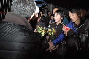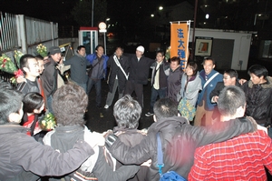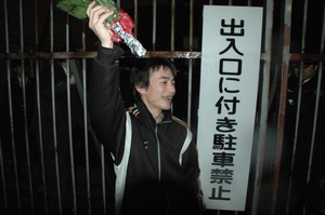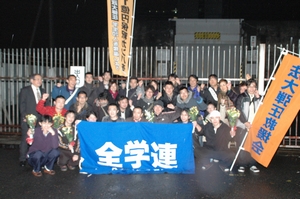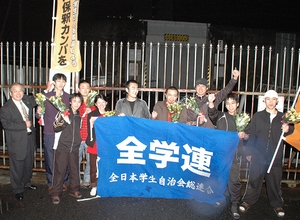 法大5・29デモ弾圧裁判被告(第1グループ)の7学生(内山佳久君、内海佑一君、後藤玲子さん、山本進君、中島敦史君、野地川泰介君、原田幸一郎君)、7・24法大弾圧被告の2学生(鈴木研也君、市川知寛君)だ。東京拘置所には、多くの仲間が出迎え、獄中闘争の勝利を讃えた!