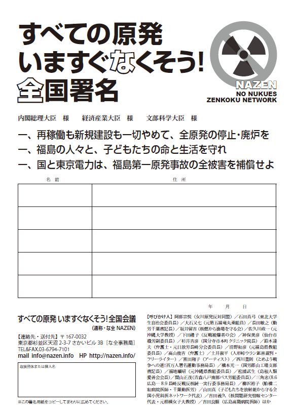 後期からは「すべての原発いますぐなくそう!全国会議」(通称NAZEN)から新たに呼びかけられた反原発全国署名を集めています。↓↓