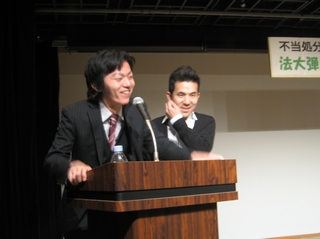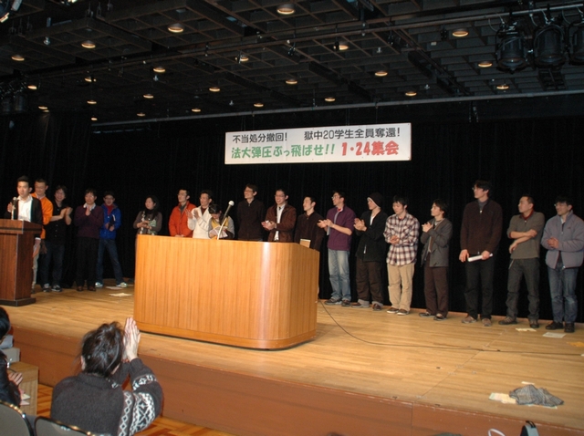 24日に行われた集会には内田君をはじめとした被告、処分とたたかう文連の学生、弁護団、支援者らが一同に会し、4月24日に法大で大集会を行うことを宣言しました。