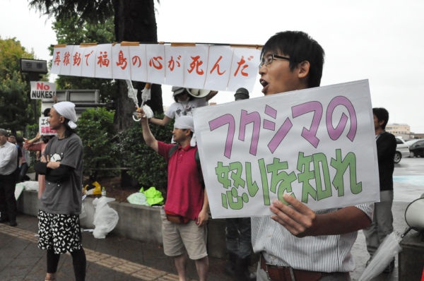 福島県庁前で首相を待っていたのは、地元住民たちによる「帰れコール」と「再稼働反対」のシュプレヒコールだった。