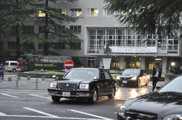 首相を乗せた車両。野田氏程度の人物でも一国の最高権力者ともなれば、厳重な警備態勢が敷かれる。後ろが福島県庁=7日午後6時25分ごろ、写真:田中撮影=