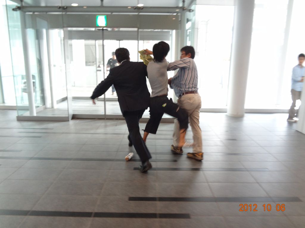 学生センター長・鈴木良則が暴力的に襲いかかり、その中で転び公妨を策動!