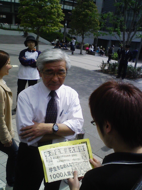 学生センター事務部長・浅見信一と学生センター長・木原章はビラをもらった新入生に対して「学生証を見せろ!」と脅迫し、暴力的に学生証をもぎ取ろうとする。そしてそのまま排除するという許し難い弾圧!!