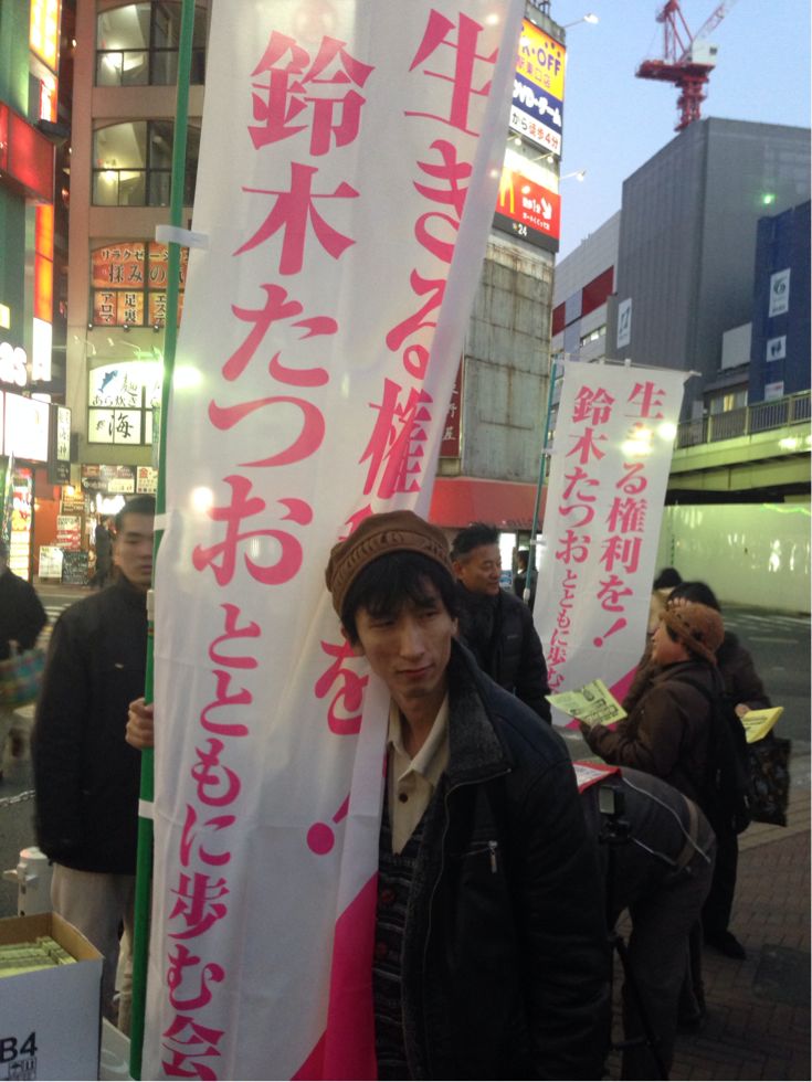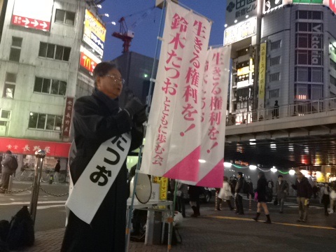 ご通行中のみなさま、本当に寒いですね。私は、今、安倍政権が進めている憲法改悪、そして戦争への突進を阻むために、弁護士として都知事選に関しての決意を固めました。さらに原発の問題、また雇用の問題。青年の今雇用問題が非常に深刻な状態を迎えております。最後に、オリンピックの問題。2020年オリンピック東京開催と言われていますが、私はこの2020年、オリンピック開催を返上しようと思います。