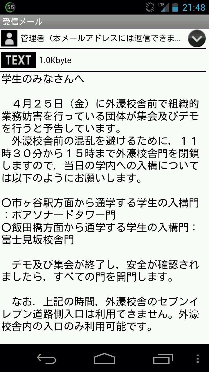 4・25法大解放総決起集会の爆発を恐れた法大当局が、法大生にキャンパス封鎖予告のメールを送信しています。