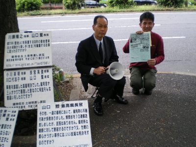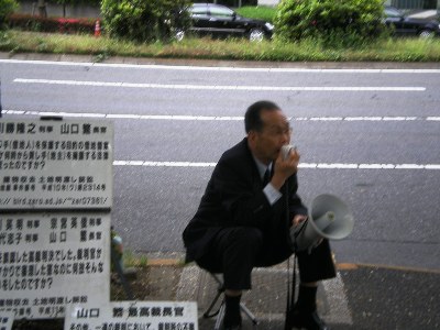 地裁前ではお馴染みこのおじさん。織田君逮捕に怒りのアジを展開!