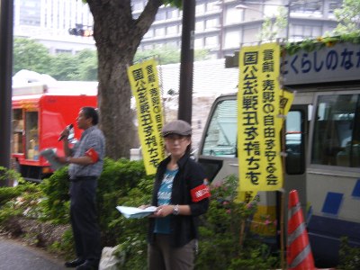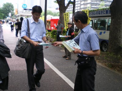 地裁前では、日共系の国民救援会もビラまき。ちなみに、言論弾圧許すなと言っていましたが、裁判員制度賛成です、この人たち。国民救援会は、20日に「いい裁判官になろう!」と題して、裁判員制度賛成集会をやります。日共の屈服をぶっ飛ばし、14日は、裁判員制度粉砕の霞ヶ関デモだ!