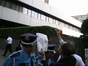 地裁前でお馴染みのおじさん! 「入れろ!」と叫ぶ! 警備員にとめられてると思ったら…。「STOP!裁判員制度」って書いてあるバッジをつけてるから、とのこと。ゼッケンやプラカードと同じ扱いらしい。ホントかよ?!