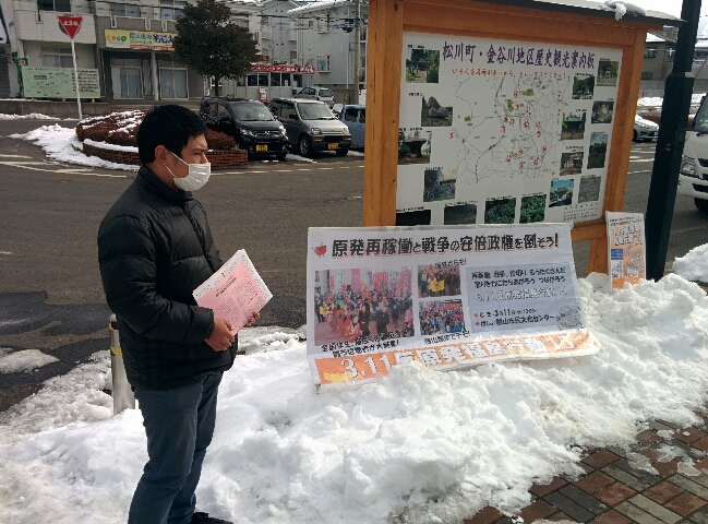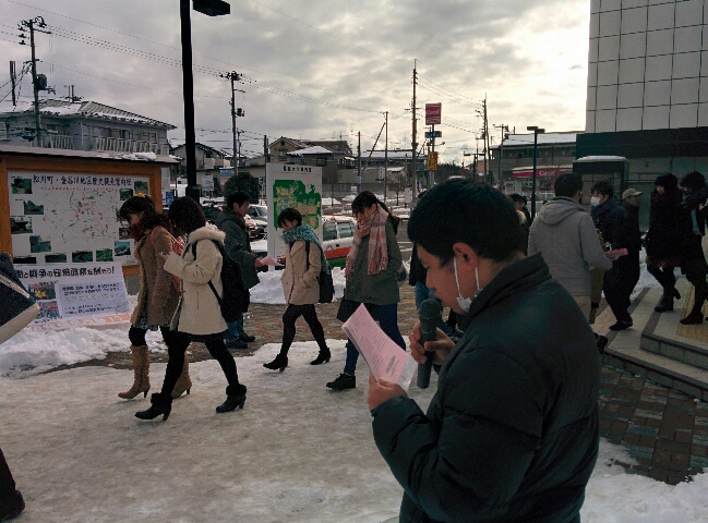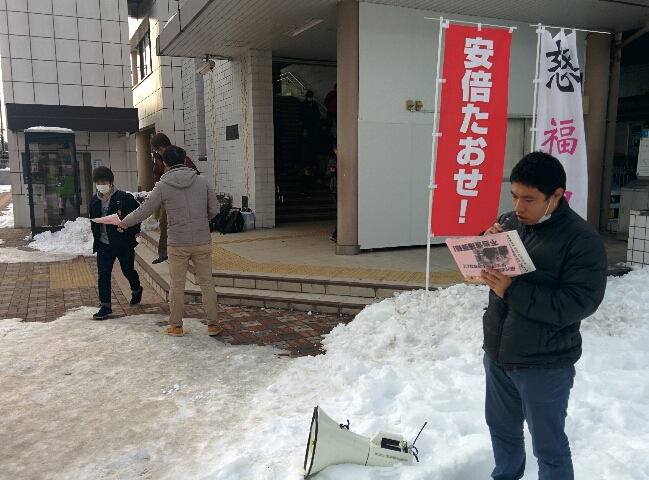 登校する学生に福島大の樋口君がマイクをとってよびかけました。「今回の逮捕は不当逮捕、暴行はでっち上げです。戦争・原発に反対する仲間への弾圧許せません。大学当局と安倍政権が一体となった攻撃だ」と怒りをこめて訴えるとともに、3・11反原発福島行動への結集をよびかけました。