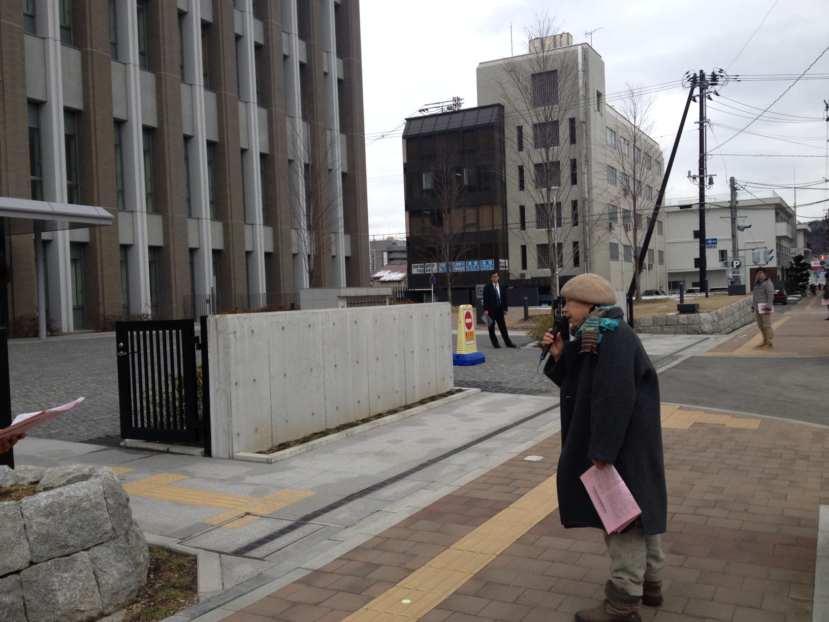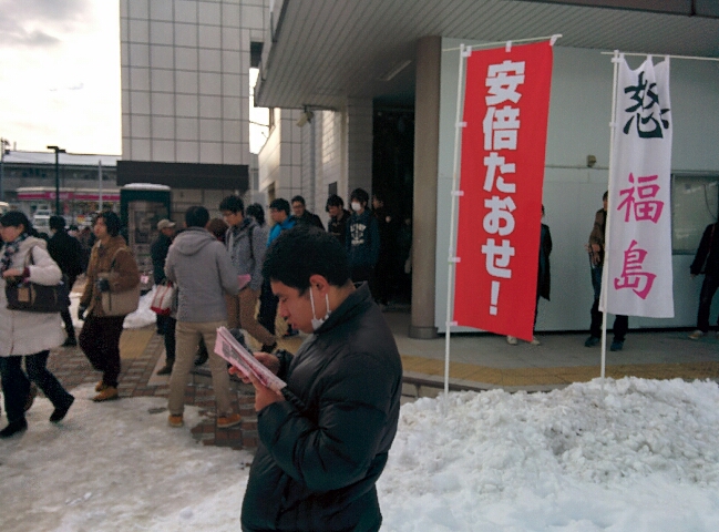 昼には裁判所前に登場。反原発福島行動実行委員会の椎名千恵子さんや福島労組交流センターの渡辺馨さんもかけつけました。椎名さんは「学生を戦場に送るなと正義の訴えをしたA君が逮捕されています。こんなことがゆるされていいのでしょうか」と熱のこもった訴え。通行人に次々とビラが受け取られました。