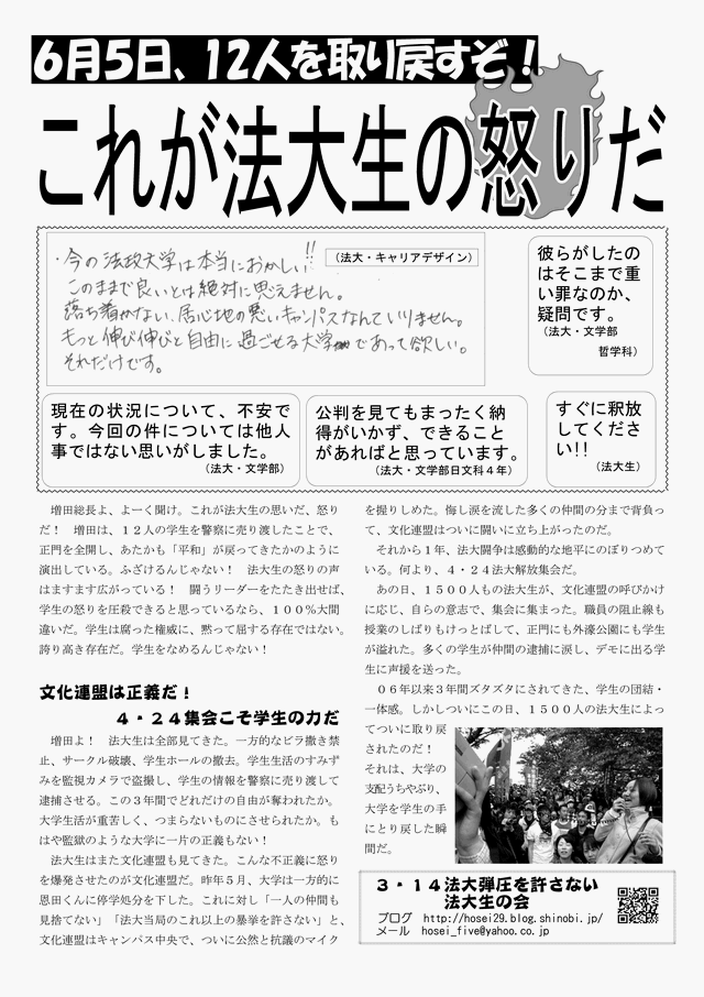 増田総長よ、よーく聞け。これが法大生の思いだ、怒りだ! 増田は、12人の学生を警察に売り渡したことで、正門を全開し、あたかも「平和」が戻ってきたかのように演出している。ふざけるんじゃない! 法大生の怒りの声はますます広がっている! 闘うリーダーをたたき出せば、学生の怒りを圧殺できると思っているなら、100%大間違いだ。学生は腐った権威に、黙って屈する存在ではない。誇り高き存在だ。学生をなめるんじゃない!
