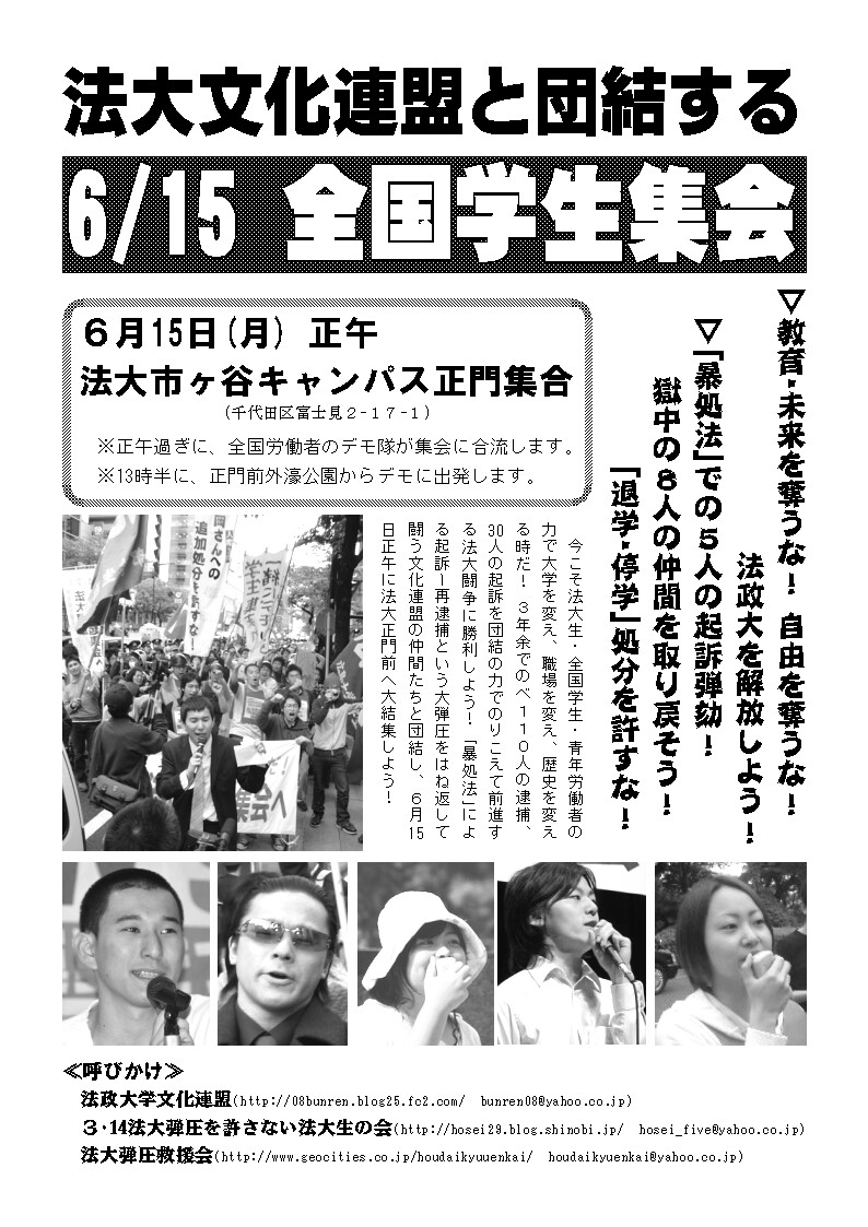 法大弾圧救援会(http://www.geocities.co.jp/houdaikyuuenkai/ houdaikyuenkai@yahoo.co.jp)