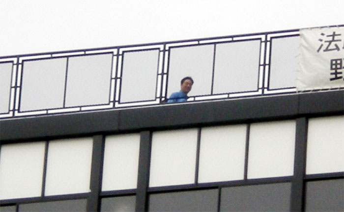 見えますでしょうか? 屋上に警備員が徘徊して集会を見ようとする学生を排除しています! 心底法大生の決起を恐れている。学生が集会を見ただけでも怒りが爆発することを恐れているのだ!