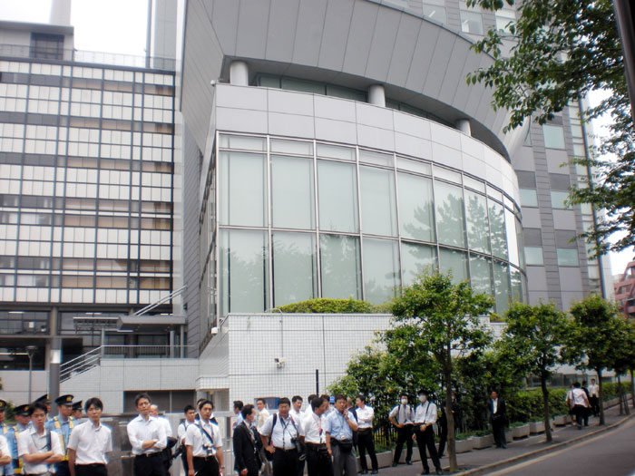 続いて、こちら写真右手です。ボアソナードタワーのラウンジですよね。いつもはラウンジからガラス越しに見通せるのですが、本日はなんと我々が登場したらブラインドが下げられました。