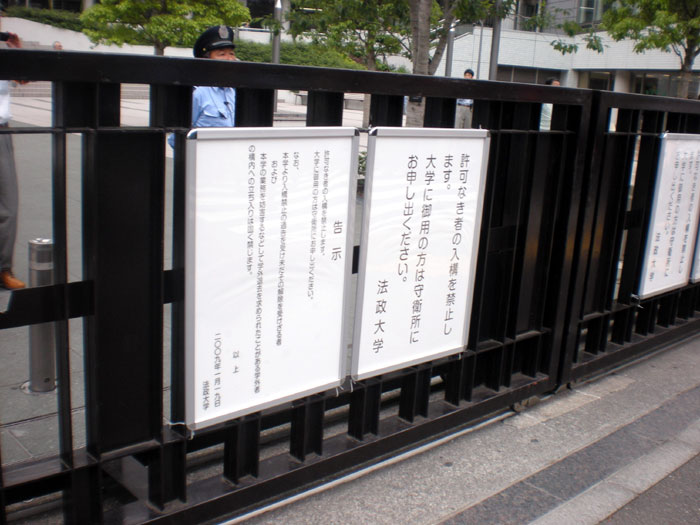こちらは言わずとしれた立て看です。これを口実に暴処法弾圧をかけてきた、あの立て看です。学生の立て看は撤去。大学当局はいくらでもふざけた立て看を出しほうだい。大学の主人公は俺たちだ! みんなで法大を解放しよう!
