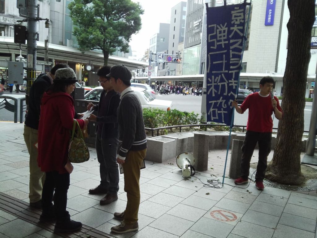 昼と夕方にかけて四条河原町でも街頭宣伝を行いましたがこちらも素晴らしい反応で、たくさんの署名が集められました。多くの人々がこの弾圧を知っていると言い、許せない!がんばれ!という激励や署名が続々と寄せられました。地元の方はもちろん、旅行で京都に来たという人たちからも支援を申し出る声があがるなど、学生の身体をはった反戦ストライキへの支持は京都内だけにとどまらない広範なものになっています。家族の分まで署名したい!という人、ぜひメールして欲しい!と連絡先を教えて来た人など本当に様々な、ここだけでは書ききれないような数の反応がありました。青年学生も含めた広い年齢層の人がビラを受け取り、署名してくれたのも特筆すべき事態ですね。今回の弾圧は完全に、団結の拡大を生むというかたちで反撃に転化しています。今日、私たちに賛同や支援を申し出てくれた方々の想いに応える意味でも、京大反戦ストライキを闘った6人の学生を一刻も早く取り返したいです。