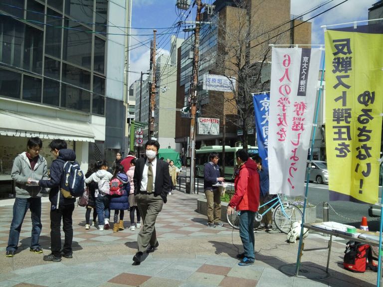 街頭では「労働者のとき、二条城から円山公園まで安保粉砕のデモをした。京大に、ふざけるんじゃないと言いにいきたい」「全学連として私も佐世保エンプラ闘争に参加した。戦争を止めるのは学生の闘いだ」「安倍は今すぐ引きずり下ろそう」「同学会にカンパを振り込みたい。がんばって!」といった反応が次々とよせられました。多くの人びとの闘いの記憶ともつながり、激励に力をもらいながら、街頭での闘いは前進しています!