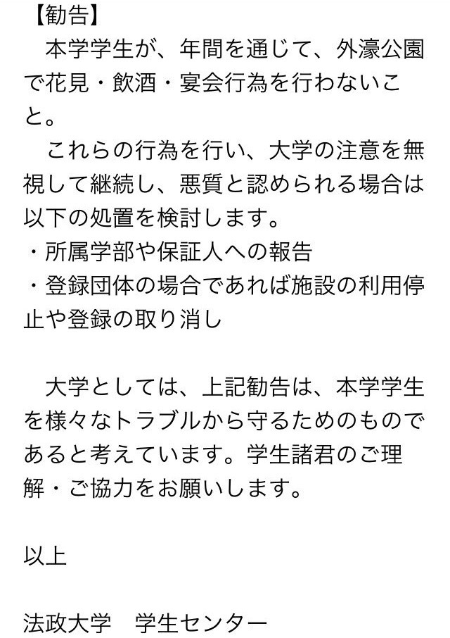 法大当局が市ヶ谷キャンパス前の外濠公園での「花見・飲酒・宴会」を「年間通じて禁止する」という前代未聞の規制を全法大生にメールで通告してきました。