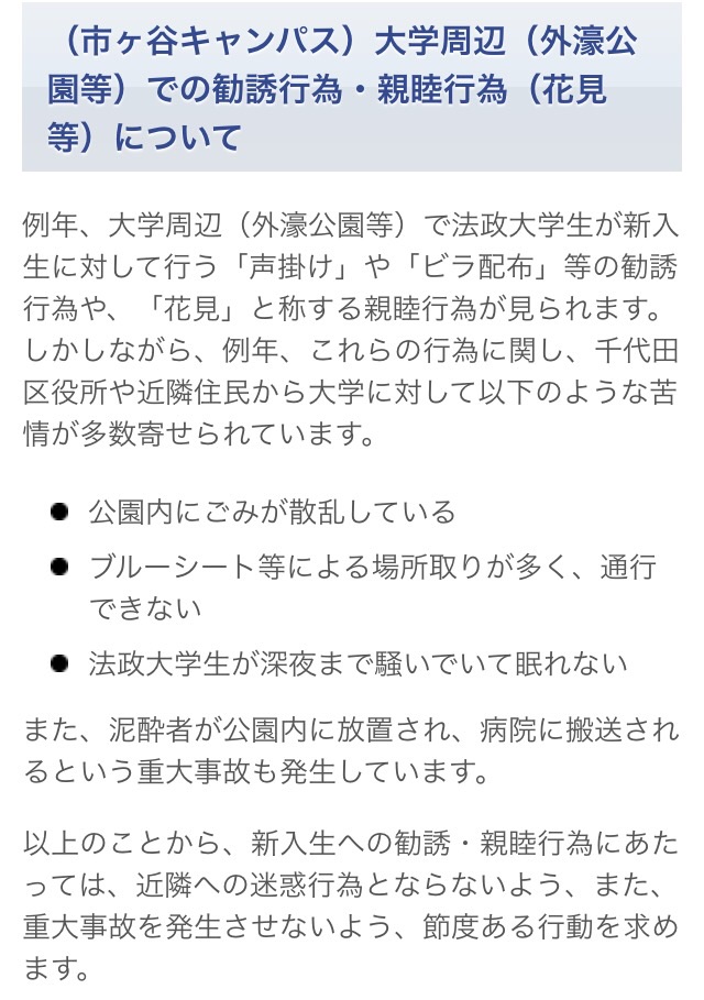 法大当局は、『例年、大学周辺(外濠公園等)で法政大学生が新入生に対して行う「声掛け」や「ビラ配布」等の勧誘行為や、「花見」と称する親睦行為が見られます』『これらの行為に関し、千代田区役所や近隣住民から大学に対して苦情が多数寄せられています』と、新歓の命である「声掛け」「ビラ配布」「花見」を、まるで「犯罪」かのように罵っています。絶対に許せません。