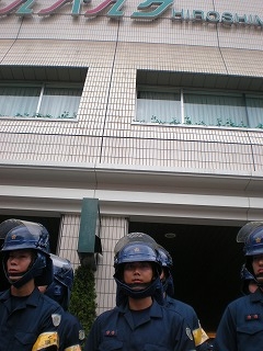 機動隊に守られた田母神講演会会場を弾劾してデモ出発