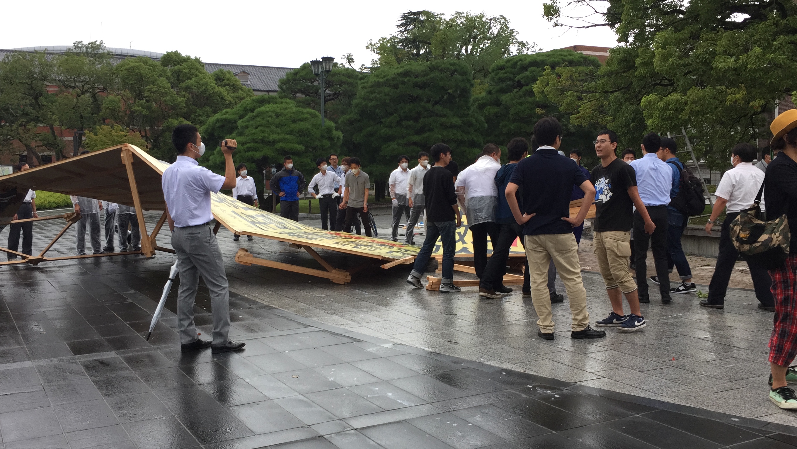 本日早朝、京大生有志がクスノキ前にたてた看板を京大当局が破壊し撤去しようとしました。